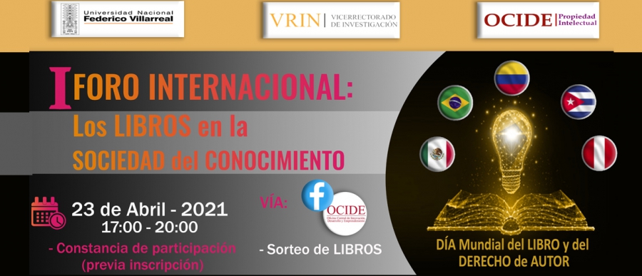 En el marco del Día Mundial del Libro y del Derecho de Autor, instituido por la UNESCO, el Vicerrectorado de Investigación (VRIN) y la Oficina Central de Emprendimiento, Innovación y Desarrollo (OCIDE), a través de la Oficina de Propiedad Intelectual, invitan a estudiantes, docentes y a la comunidad villarrealina en general a participar del I Foro Internacional: Los Libros en la Sociedad del Conocimiento a realizarse el viernes 23 de abril de 5:00 p.m. a 8:00 p.m.